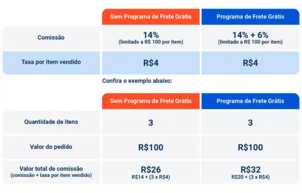 Sellers participating in the Free Shipping Program are charged an additional 6% + R$4 per item sold.