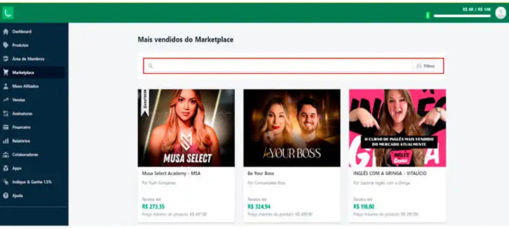 2- Within the Kiwify Marketplace, users can find all the products available on the platform and pay commission. It is also possible to search for a specific digital product by name or using filters;